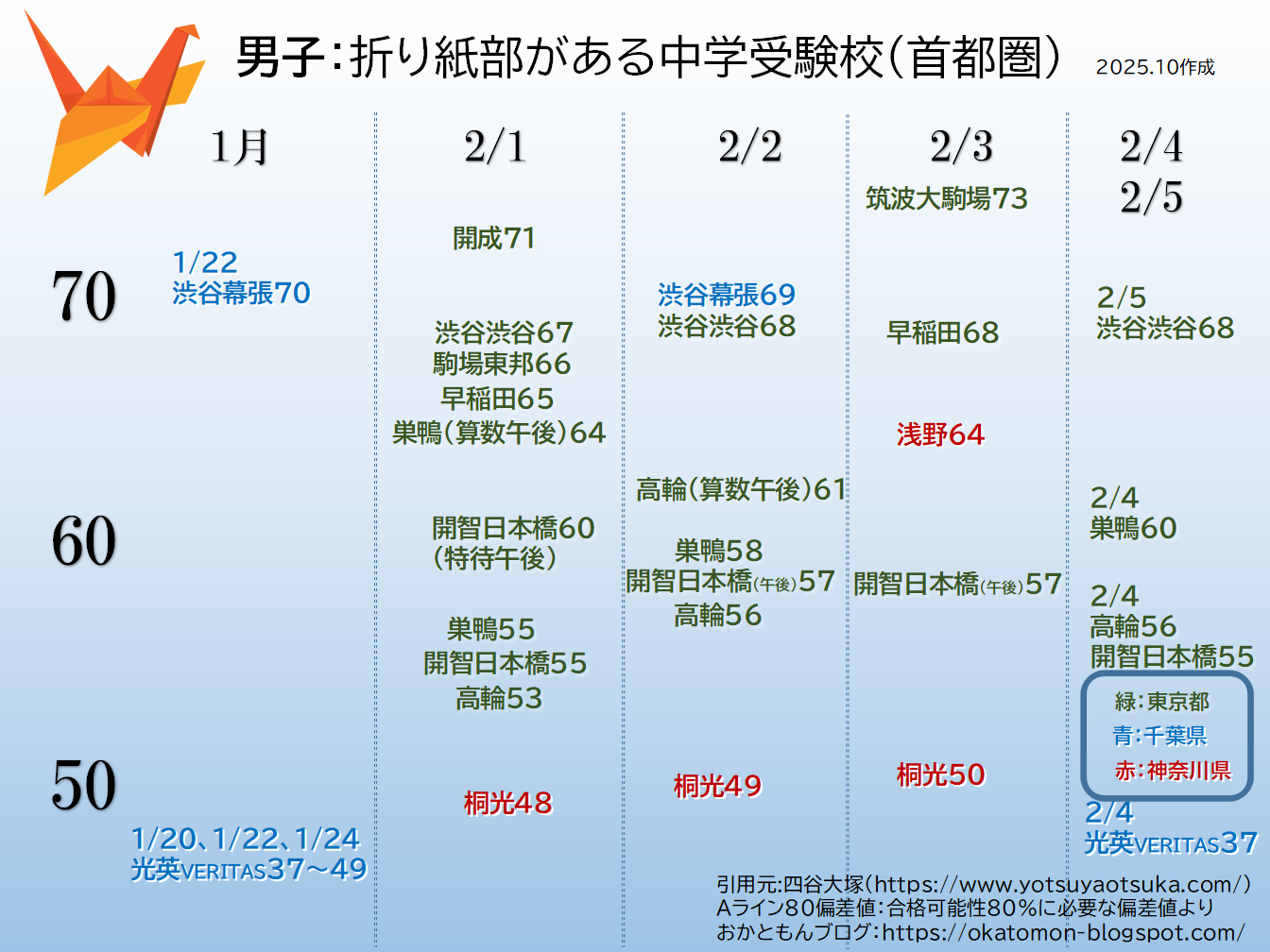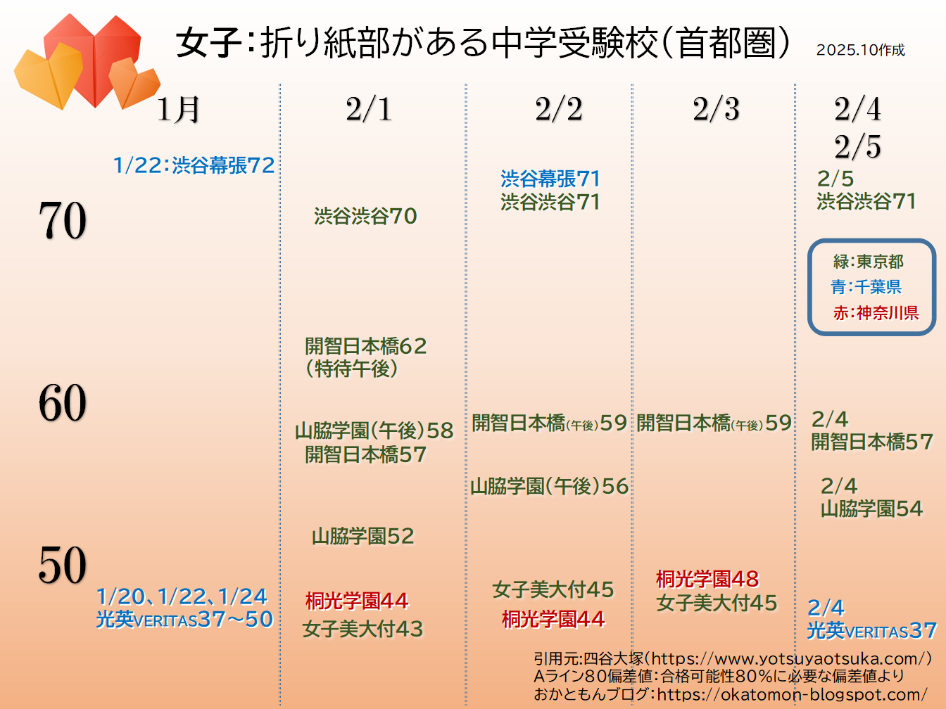 折り紙部がある中学受験校(首都圏)の偏差値一覧表