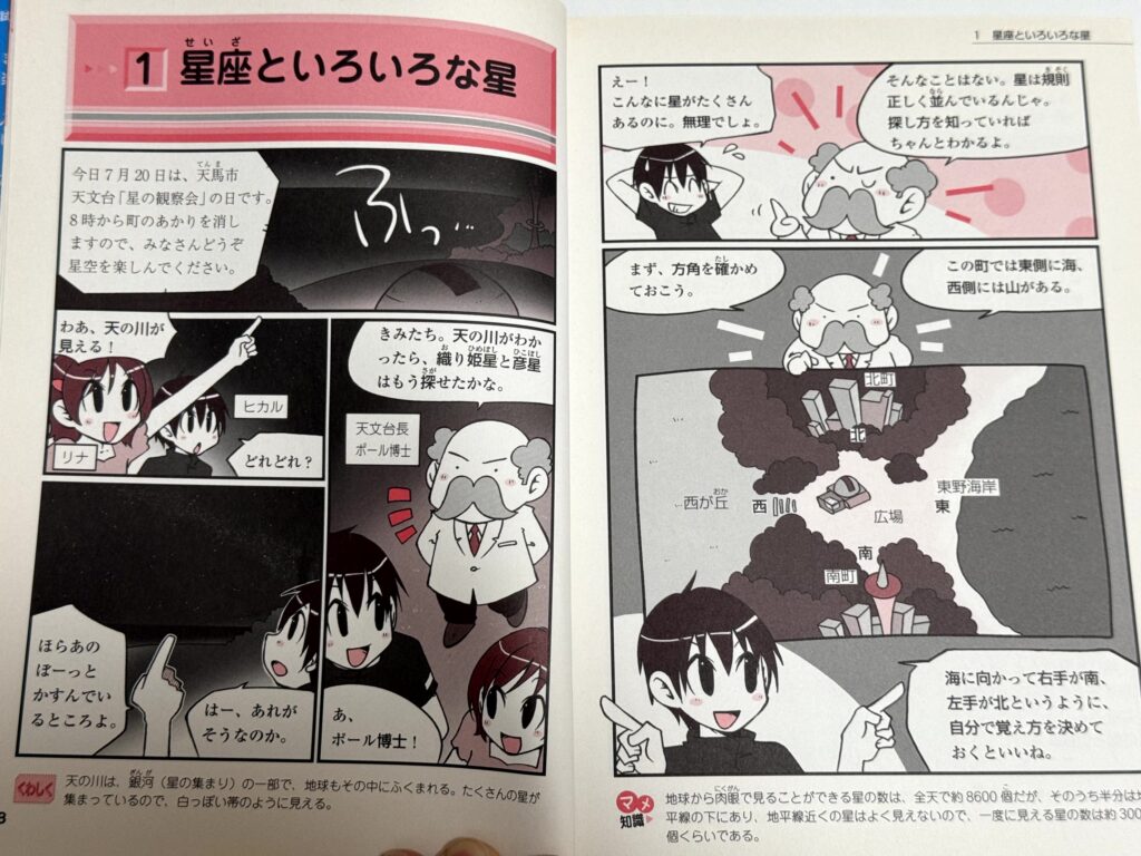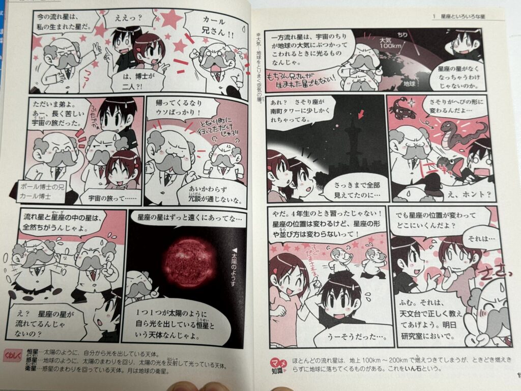 動物や植物、星や実験道具など、多くの理科用語がマンガに登場します。イラスト付きで早期に言葉を覚えることで、後々の学習がスムーズになります